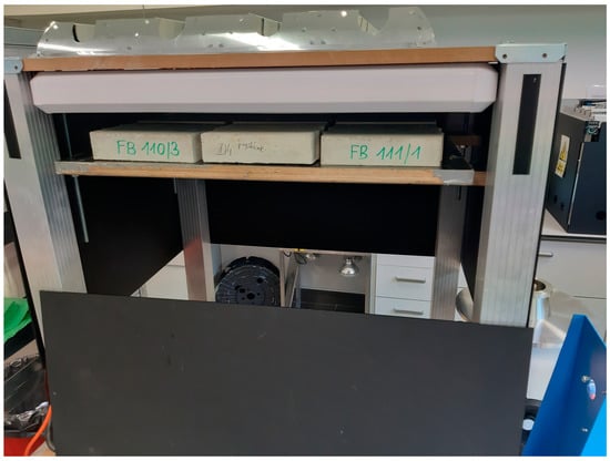 The contact angle test was performed based on the BS ISO 27448 [] standard on specimens with dimensions of 40 mm × 140 mm × 160 mm after 28 days of curing to investigate the self-cleaning properties of photocatalytic cementitious mortars. Before the test, samples were pretreated by dipping the tested surface in an n-heptane solution and drying at 70°C for 15 min afterward. Samples were then set aside for 30 min to cool to room temperature. Next, the initial contact angle of distilled water was measured five times in different locations on a tested surface via a goniometer. Afterward, samples were placed in an irradiation chamber, where they were irradiated with UVA radiation (Philips BLB 8W fluorescent lamps) with an irradiation of 10 W/m2 (Figure 11).