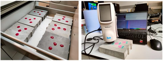 The self-cleaning properties of photocatalytic cementitious mortars were also tested via a rhodamine test based on UNI 11259 []. The test monitored the colorimetric changes of rhodamine drops on photocatalytic material subjected to UV radiation. On the tested surface, four spots were marked with a solution of rhodamine with water at a concentration of 0.1 g/1000 g. Each drop had a volume of 0.5 milliliters, following the UNI 11259 standard [], and was measured with a single-channel automatic pipette. The samples were stored in the dark for 24 h until the drops were absorbed. After the drops were absorbed, an initial measurement was made using a spectrophotometer of the NS 810 series (Figure 12). Spectrophotometry is a technique to measure light absorption. It uses a light beam that passes through the sample, which absorbs or transmits light over a specific wavelength depending on its color. Data from the test can be used to determine sample color using various color spaces—in the case of the conducted research, the CIE Lab color scale.
