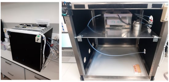The effectiveness of air purification from gaseous pollutants—nitrogen oxides—was carried out following the procedure developed as part of the project “Technology for the production of innovative self-cleaning prefabricated facade and surface elements that improve air quality”, TECHMATSTRATEG-III/0013/2019. The test subject was photocatalytic cementitious mortar samples with dimensions of 40 mm × 140 mm × 160 mm. After demolding, the samples were cured for 28 days in a curing chamber. Before the test, the tested surface was cleaned of contamination. In the first step, the surface of the test sample was sprinkled with distilled water and scrubbed. Then, the sample was dried at 60 °C for two hours and placed in the irradiation chamber for 16 h with the test surface facing the light source, where the surface organic impurities were burned in UV-A radiation with an irradiance of 10 W/m2. In the last step, the tested surface of the sample was cleaned again with distilled water to remove impurities burnt out in the previous step and dried again at 60 °C for 2 h. The effectiveness of cleaning the air from gas pollutants was tested at the earliest two hours after the last drying cycle of the sample. Cleaned of impurities, the sample was placed in the glass reaction chamber, with the tested surface facing the light source. The glass reaction chamber was tightly closed and sealed (Figure 13). UV-A LED strips (360 ± 5 nm, 14.4 W/m) were used as a UV-A light source, and Sun-Like™ TRI-R™ LED strips (5000 K) were used as a visible light source. The UV-A and UV-B irradiation of the visible light source on the sample’s surface was 0.0 W/m2, and the global irradiation was 150 W/m2. The UV-B irradiation of the UV-A light source on the sample’s surface was 0.0 W/m2, and the global irradiation was 1.2 W/m2. UV-A and UV-B irradiations were measured using Delta Ohm pyranometers: UV-A (315–400 nm) and UV-B (280–315 nm). The global irradiation was measured using a Lambrecht METEO pyranometer in the range of 285–3000 nm. The temperature in the glass reaction chamber during the experiment was kept at a value of 25 ± 3 °C, and relative humidity at a value of 40 ± 5%. The gas flow was kept at a constant value of 2 L/min.