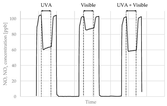 The nitrogen oxide concentration was approximately 100 ppb to model the actual NOx concentration in the urban environment. UV-A and visible light irradiance were chosen as 0.2 and 150 W/m2 to model the actual summer solar radiation conditions in the Polish territory (UV index of 8–9 and visible light irradiation of 1000 W/m2–150 W/m2 were the maximal settings of the testing apparatus).