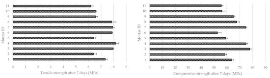 Mechanical strength tests after seven days of curing also showed significant differences (Figure 15). The tensile strength for all series was in the range of 6.19 MPa (mortar 11) to 8.15 MPa (mortar 4). For compressive strength, the difference between different series was more significant—the mortar with the lowest compressive strength was mortar 11 (55.77 MPa), and the highest was mortar 3 (77.7 MPa).