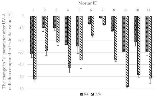 To determine the self-cleaning properties of photocatalytic cementitious mortars, it was investigated whether the measurement results followed the assumptions of UNI 11259 (Equations (4) and (5)) []. To characterize any surface with self-cleaning properties, the change in a* parameter after 4 h under UV-A radiation should be greater than 20% (R4) and greater than 50% after 24 h (R24). The a*(x) describes the reading on a* parameter with a spectrophotometer after irradiating samples for x hours in an irradiation chamber.