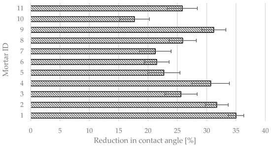 The lack of influence of the type of photocatalyst on the properties of photocatalytic mortars, despite the differences in their properties (mainly specific surface and crystallite size), was probably caused by the susceptibility of a TiO2 of a higher specific surface area to agglomerate (TiO2 (A)). Usually, the higher the surface area, the higher the risk of agglomeration of any material [,]. In the performed research, it is probable that TiO2 (A), a photocatalyst of a higher potential in air purification, had reduced to a level comparable with TiO2 (B). It could be argued that using photocatalysts of high specific surfaces could prove ineffective in cementitious composites; however, such a claim requires further studies on the subject.
