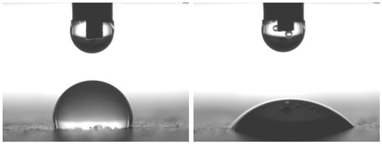 The contact angle between the self-cleaning surface and the drop of distilled water. The photograph to the left shows the initial contact angle and to the right after 72 h of UV-A radiation for the photocatalytic mortar 4.