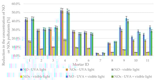In the case of the prepared photocatalytic cementitious mortars, the reduction in concentrations of both NO and NOx varied significantly between different series and in various types of radiation present (UV-A, Visible, or both). The lowest reduction in all irradiation environments was observed for mortar 7—for UVA reductions were 3.1% and 2.7% for NO and NOx respectively, for TRI-R reductions in pollutant concentrations were 0.9% and 0.4% for NO and NOx respectively, and for combined UVA and visible light reductions were 3.4% and 3.0% for NO and NOx, respectively. The highest reductions in nitrogen oxides were observed for mortar 4—for UVA reductions were 52.4% and 52.1% for NO and NOx, respectively, for TRI-R reductions in pollutants concentrations were 18.3% and 18.2% for NO and NOx, respectively, and for combined UVA and TRI-R reductions were 51.6% and 50.1% for NO and NOx, respectively.