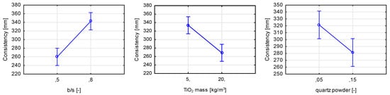 Marginal mean charts for statistically significant variables for consistency of prepared cementitious mortars in order of significance from the left—b/s ratio, TiO2 mass content, and the replacement percentage of cement with quartz powder.