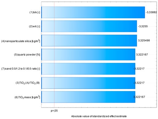 The segregation of individual components of fresh mortar is closely linked with its rheological properties []. If the yield stress of fresh mortar is high, it is characterized by low consistency. In addition, as its plastic viscosity increases, the time required to reach a specific flow increases. In the conducted study, the time required for the fresh mortar to flow to a diameter of 200 mm was measured—an indirect study on the influence of selected variables on the viscosity of fresh mortars. All assumed variables in the assumed range of variability had a statistically significant effect on the rheological properties of fresh mortars (Figure 21). In this graph, the effect ratings obtained by the ANOVA procedure are ordered from the highest absolute value to the lowest. The value of each effect is represented by a bar and a line that indicates how large the effect should be to be statistically significant (in the conducted research, the p-value was chosen at a standard value of 0.05).