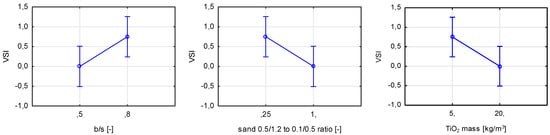 Marginal mean charts for statistically significant variables for VSI of prepared mortars in order of significance from the left—b/s ratio, the ratio between sands 0.5/1.2 and 0.1/0.5, and TiO2 mass content.