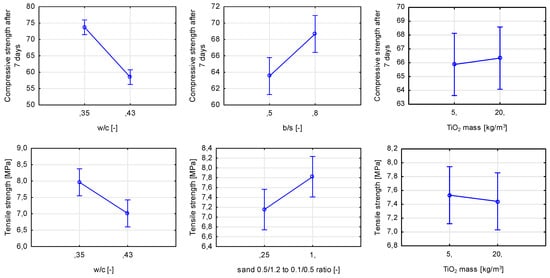 Marginal mean charts for statistically significant variables for compressive and tensile strength of hardened mortars after seven days of curing in order of significance from the left—w/c ratio and b/s ratio for compressive strength and w/c ratio and ratio between sands for tensile strength. The last graph for both compressive strength and tensile strength shows an influence of one of non-significant variables—TiO2 mass content.