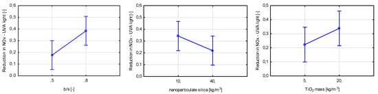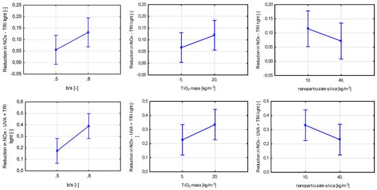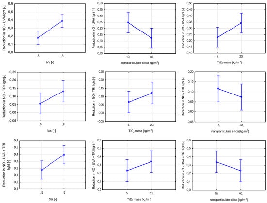 Marginal mean charts for statistically significant variables for efficiency in air purification from NO under different light sources (UVA light, visible light (TRI), UVA + visible light) in order of significance from the left—b/s ratio, nanoparticulate silica mass content, and TiO2 mass content for UVA light and b/s ratio, TiO2 mass content, and nanoparticulate silica mass content for both visible light and UVA + visible light.