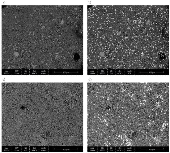 Agglomeration phenomenon of TiO2 grains—SEM (SE) micrographs of the surface of prepared mortars with EDS mapping of qualitative imaging of TiO2 presence: (a) SEM (SE) of mortar of b/s = 0.8; (b) SEM (SE) with EDS mapping of TiO2 (white grains) of mortar of b/s = 0.8; (c) SEM (SE) of mortar of b/s = 0.5; (d) SEM (SE) with EDS mapping of TiO2 (white grains—agglomerates) mortar of b/s = 0.5.