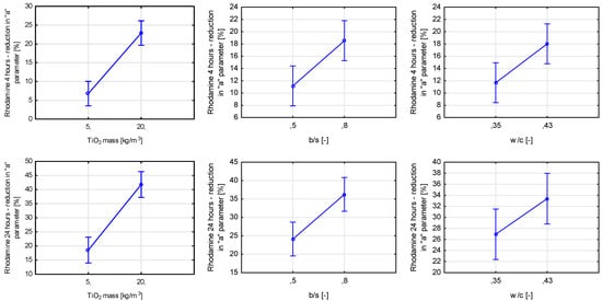 Marginal mean charts for statistically significant variables for self-cleaning via rhodamine test after 4 and 24 h of radiating samples with UVA light in order of significance from the left—TiO2 mass content, b/s ratio, and w/c ratio.