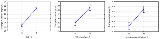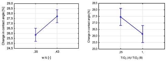 Finally, the final self-cleaning test concerning the change in the contact angle between a drop of distilled water and the tested surface showed a statistically significant influence of five assumed variables (Figure 28). The most significant of them was the binder-to-sand ratio, followed by TiO2 content and nanoparticulate silica mass content. All of the significant variables influenced the contact angle reduction after exposure to UVA radiation, except the ratio between the two photocatalysts used in the study. As in the rhodamine test, the properties of the tested surface, except the TiO2 content, influenced the course of the test.
