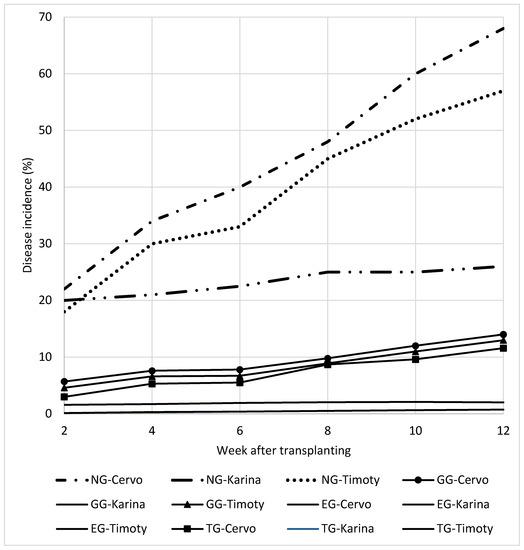 Different varieties showed different levels of disease incidence, as shown by ANOVA (see Table A1). The un-grafted tomatoes were affected by wilt diseases starting two weeks after transplanting (Figure 1). The disease incidence increased until 12 weeks after transplanting. The wilt incidence of grafted tomatoes (undotted lines) was much lower than the counterparts (dotted lines) during the same period.