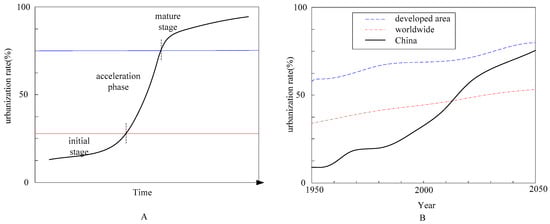 China’s urbanization process. (A). Urbanization rate curve and its corresponding development stages; (B). Comparison of urbanization levels and trend forecast.