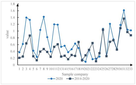 Figure 5 reflects the eco-efficiency values of the 33 companies in 2020 and the average eco-efficiency values of the 33 companies in 7 years. By comparing the average eco-efficiency of 33 companies between 2020 and 7 years, it is obvious that almost all companies’ eco-efficiency values are higher than the average. Table 3 reflects the annual changes in the eco-efficiency value of 33 companies over the past 7 years. It can be found that 2017 was a step, and the eco-efficiency value increased significantly. This shows that in recent years, the implementation effect of the energy-saving and emission-reduction policies formulated by the Chinese government has shown. With the strengthening of environmental supervision by the state and the emphasis on environmental governance by enterprises, the overall eco-efficiency level of listed companies in heavily polluting industries is also rising.