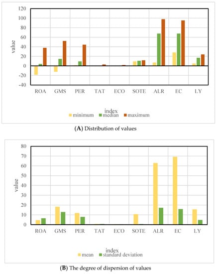 (1) The average return on assets (ROA) and gross margin of sales (GMS) of each company are 4.580% and 18.354%, respectively, indicating that the average return on sample companies is positive. (2) The median of the period expense rate (PER) of the sample enterprises is less than the mean (9.43011.903). That is, half of the enterprises’ period expense rates are lower than the mean, indicating that the sample enterprises’ period expense management and control efficiency is high. (3) The average value of the total asset turnover (TAT) of the sample companies is greater than the median (0.7340.519). That is, the total asset turnover of half of the sample companies is less than the average value, indicating that the turnover speed of more than half of the sample companies is relatively slow and the operating capacity is weak. (4) The median of the eco-efficiency (ECO) of the sample enterprises is less than the mean value of eco-efficiency (0.3820.489), indicating that the eco-efficiency of most enterprises does not reach the average level. In addition, there is a big difference between the minimum value of 0.012 and the maximum value of 1.712 for the eco-efficiency of the sample enterprises, indicating that the eco-efficiency levels of the sample enterprises are uneven. (5) The minimum and maximum logarithm of total assets (SOTE) are 9.425 and 11.757, respectively. The mean and standard deviation are 10.693 and 0.539, respectively, indicating that there is little difference in the scale of sample enterprises. The median (67.3%) of the asset-liability ratio (ALR) of the sample enterprises is greater than the mean value of the asset-liability ratio (62.875%), indicating that at least half of the sample enterprises have an asset-liability ratio greater than 62.875%. The average shareholding ratio of the top ten shareholders is 69.254% [33].