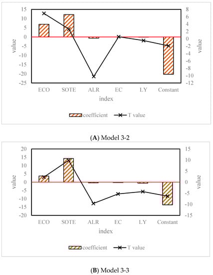 It can be seen from Figure 8B that ECO is significantly positively correlated with the total asset turnover (TAT) (p < 0.01), indicating that the improvement of ecological efficiency helps the turnover of assets. The improvement of ecological efficiency can help improve the utilization efficiency of listed companies’ assets, which verifies the hypothesis . At the same time, it can also be found that the regression coefficient of enterprise size is −0.4650 (p < 0.01), indicating that enterprise size as a control variable is significantly negatively correlated with total asset turnover. The asset turnover rate is not related to the total asset turnover. The regression coefficients of equity concentration and listing years are 0.0084 (p < 0.01) and 0.0115 (p < 0.05), respectively, indicating that the equity concentration and listing years as control variables are significantly positively correlated with the total asset turnover.