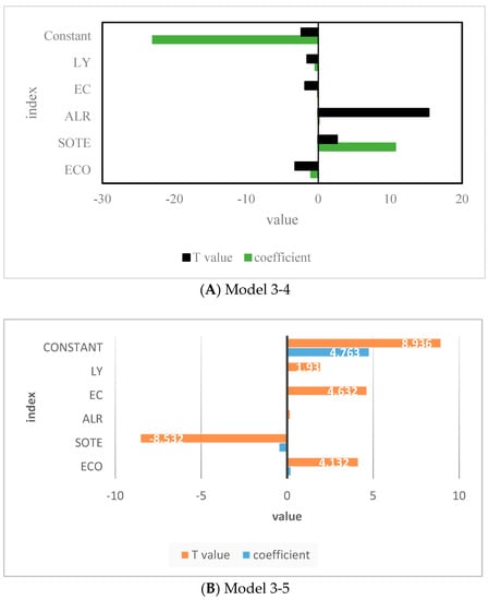 According to the article, four panel data models of the impact of environmental economic transformation on ecological efficiency were constructed to test the direction and extent of the impact of environmental economic transformation on ecological efficiency. It was originally assumed , that is, the intercept term of all individuals is the same. When the obtained p value is 0.0000, the null hypothesis is strongly rejected. The fixed effect model is selected, otherwise, the random effect model is selected. From the Hausman test results in Table 7, it can be found that the p-value obtained by model (3-3) and model (3-5) is 0.0000, rejecting the null hypothesis and choosing the fixed effect model, while model (3-2) and model (3-4) choose a random effects model.