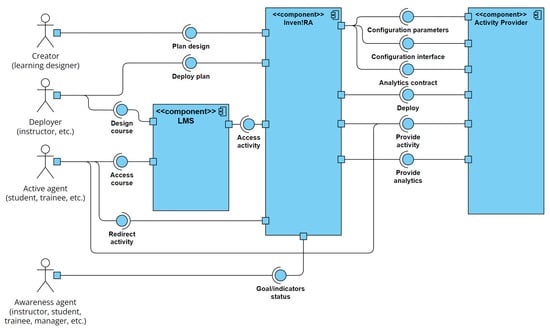In Figure 1, we represent the possible roles, which may be different people or indeed the same individual. A Creator designs learning plans, which Inven!RA calls Inventive Activity Plans (IAP). A Deployer deploys them, i.e., instantiates an IAP. A typical scenario involves an instructor providing an IAP to a specific class, but it could be an autonomous learner initiating a personal IAP or a managerial/technical individual. The instantiated IAPs can be included in an LMS course by the Deployer. An Active Agent accessing the course in the LMS can then access the activities in the IAP, brokered by the platform implementing Inven!RA, which provides personal data protection between the LMS and the third-party Activity Provider, as well as—critically—ensuring that analytics tracked at the Activity Provider are associated with the activity’s specific instance deployed for an IAP. The Active Agent is typically a student but could also be an instructor involved in cooperative learning scenarios or some other participant. Finally, an Awareness Agent accesses Inven!RA to check the status of the IAP goals and indicators. This can be an instructor seeking to orchestrate the class but could also be a student seeking to self-regulate or co-regulate learning, a manager/chair seeking to support the course, or some other relevant role. We based the design of the Inven!RA software architecture on two contributions. The first inspiration was the early effort of the BEACONING architecture [], which put forward that a videogame could provide an overall narrative to a learning activity, and minigames could be embedded in it. BEACONING included an overall gamified lesson plan providing transversal analytics on plan goals collected from the various minigames. Inven!RA moves beyond the restrictions of having a videogame narrative controlling the activities path and does not require screen-based activities. Rather, in Inven!RA, any activity can be incorporated in an IAP as long as its Activity Provider collects individualized analytics in association with an instantiated IAP, enabling the use of immersive learning environments which are not screen based, such as pervasive Internet of Things environments or mixed-reality scenarios. The second inspiration was Baptista’s Triadic Certification Approach for game-based learning [], which foresees that training activities are mapped to different contributions to competence levels, enabling awareness of competence development from fulfilling game or simulator challenges. Inven!RA takes this concept beyond certification and into overall awareness of learning aspects. The path from these two inspirations into the form we are presenting here is described in the Methodology Section 4.