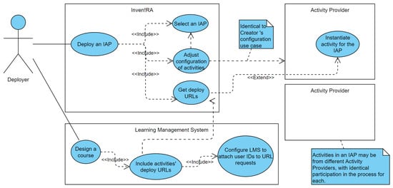 - As shown in Section 3, Figure 5, on IAP deployment, the Deployer can customize the configuration of any activity. So, we idealized a “SCORM Activity Provider” requiring a configuration parameter: the URL or alternative identification of the SCORM object placed by the Deployer in the LMS course (while we represented this activity at the bottom of Figure 5, there is no dependence and the course design can be initiated prior to the Inven!RA deployment, as is shown in the use-cases diagram, Figure 4);