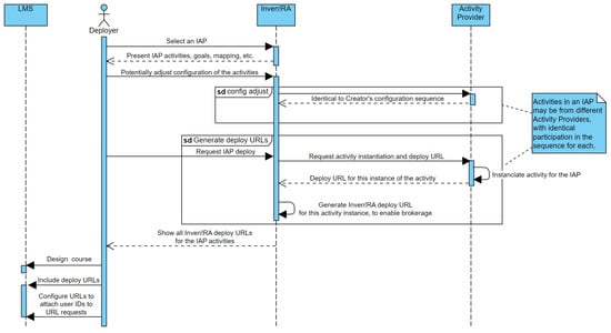 When the Deployer selects an IAP for deployment, there is an opportunity to adjust the configuration of each activity. For instance, a teacher performing the deployment may want to reflect class sizes, linguistic preferences, etc. This could also be the moment to associate this deployment with some budget or service acquisition, or with access keys. The process is identical to the Creator’s in Figure 3. When the Deployer eventually requests actual deployment, Inven!RA instructs all Activity Providers behind the individual activities to instantiate them and return deploy URLs. These URLs will contain any keys or information that the Activity Provider requires in order to associate requests with these instances of activities. However, these URLs cannot be exposed outside Inven!RA because calling them directly would bypass Inven!RA and thus impede brokering the interactions. Therefore, as shown in Figure 5, Inven!RA generates a matching Inven!RA deploy URL for each activity instance. The Deployer can then access its LMS normally to design a course and include these Inven!RA deploy URLs, configuring them to attach the LMS UserIDs when those URLs are clicked/requested. This configuration will later enable an analytics association with individual LMS users, as shown in the Active Agent case below.