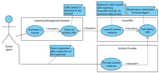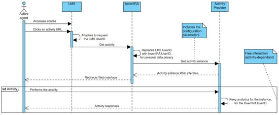 The Active Agent accesses a course on the LMS and eventually may click on one of the activity URLs. The aforementioned configuration performed by the Deployer will cause the LMS to attach the LMS UserID to this request, identifying the agent and thus enabling associating analytics with it. Upon receiving this request, Inven!RA replaces this LMS UserID with an internal Inven!RA UserID to prevent the third-party Activity Provider from receiving this personal data identifier. Inven!RA also attaches the configuration parameters to the request for this instance of the activity and forwards the request to the Activity Provider. The Activity Provider responds with the Web interface for the activity, which is then redirected by Inven!RA to the Active Agent, thus enabling henceforth the performance of the activity. While the activity is taking place, the Activity Provider collects analytics, associating them with the Inven!RA UserID and the particular activity instance.