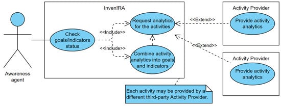 The last point was the critical realization: it is Inven!RA that must account for the possibility of having to collect data from the LMS, via an Activity Provider, and map the analytics accordingly. That is, Inven!RA needs to know if the analytics from a specific Activity Provider will be provided using Inven!RA UserIDs, as hitherto assumed, or using the same LMS UserIDs that Inven!RA avoids exposing. Consequently, this scenario only impacts the Awareness Agent case. All it takes is for Inven!RA to be aware of that circumstance with an activity to be able to perform the action “Combine analytics from the activity instances into goals and indicators”, with no redesign being required of the architecture (Figure 9).