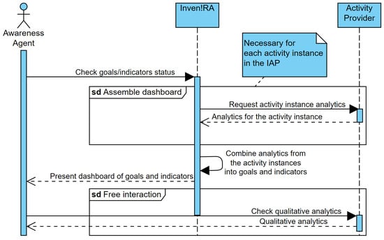 As put forward in Section 3.1, the Awareness Agent can be anyone that requires better awareness to perform: an instructor, a student manager, program chair, etc. When the Awareness Agent accesses Inven!RA to check a dashboard, Inven!RA requests each Activity Provider with instances involved in the IAP for the current analytics for their activity instances. The various analytics are then combined into information for the goals and indicators specified by the Creator (see Figure 2 and Figure 3). Any user-specific restrictions are also employed here (for instance, if the Awareness Agent is a student, the pedagogical option may be to restrict visibility only to their personal information).
