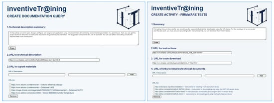 The scenario for the demonstration and evaluation was supporting the vocational education and training teaching of microelectronics education. Two activities were designed, with distinct levels of complexity. The plain activity consisted of providing a set of readings. The more complex activity consisted of having students program their physical Arduino micro-controllers for data harvesting from environment sensors. Both are detailed by Cota et al. []. The configuration screens were similar, with a summary of the activity instructions and links or buttons to download resources, as shown in Figure 11.