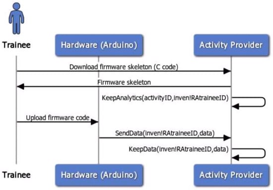 The activity providing a set of readings enabled the integration testing of the Activity Provider implementation and the Inven!RA platform implementation but was otherwise trivial. The Arduino programming activity was more interesting as it required validating that Students (in the current terminology, Active Agents) could indeed conduct activities, some of which had no Web interface, and still generate analytics for the awareness of the teacher via Inven!RA. Figure 12 shows the specific process taking place after the (simulated) trainee accessed the activity URL in the LMS.