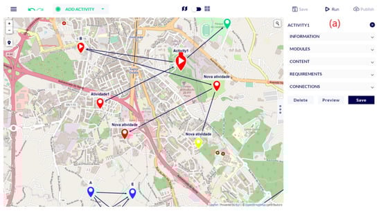 In parallel with Scenario 1, we employed Inven!RA to try solving the problem of providing an authoring tool for georeferenced tourist experiences and enabling tourists to enjoy those experiences ([], pp. 66–67). This was the context of an activity produced in the CHIC project (Cooperative Holistic View on Internet and Content), a consortium between academia and private industry partners. The functional and integration tests offered similar insights to those of Scenario 1, but two significant requirements emerged, which impacted Inven!RA. Both are visible in the developed front end (Figure 14). The first is that the consortium required the authoring front end to have a consistent look and feel to that of the other experiences of users (e.g., their mobile app and Web site), quite distinct from Inven!RA’s early authoring front end shown in Figure 10. The second is that while georeferenced activities could be configured with georeferenced data using Inven!RA, that information had to be displayed in the authoring front end. That is, the activities could not simply be organized ad hoc, they had to be situated on a map, based on their georeferenced configurations.