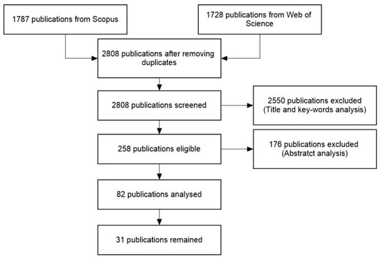 The PRISMA methodology followed is described in Figure 1. After duplicates were removed, 2808 publications remained. Then, to identify the relevant publications, the title and keywords were analyzed. In this analysis, the publications that were not focused on a PMS were identified, and this resulted in the removal of 2550 publications. Of the remaining 258 publications, 176 were removed after analysis of the abstracts, due to their lack of connection to the PMS subject. Lastly, the 82 remaining publications were analyzed in detail, and the ones that referred to barriers, obstacles or difficulties in implementing and maintaining a PMS were selected, resulting in a final list of 31 publications to be considered for the analysis of the obstacles to PMS effectiveness.