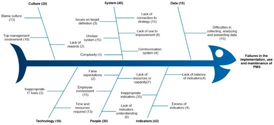 As a way of presenting the categories and types of obstacles visually and in a simplified manner, an Ishikawa (fishbone) diagram was used, allowing the analysis of the relationship between the problem and its possible causes []. Figure 3 depicts the Ishikawa diagram for the problem “Failures in the implementation, use and maintenance of PMS”. In the main spines are represented the six categories, while the 19 types of obstacles identified are represented in the secondary spines. In front of each category and type of obstacle is the frequency with which it is referred to in the literature.
