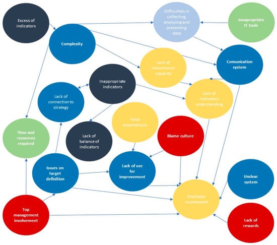 In Figure 5, it is possible to identify the 19 types of obstacles and the interactions between them. Each circle represents one type of obstacle: in red are the obstacles from the category Culture, in blue from System, in green from Technology, in light blue from Data, in yellow from People and in dark blue from Indicators. The arrows express the probable cause–effect relationships between different obstacles. It is possible to observe, for example, that eight of these obstacles can be a cause for the lack of employee involvement.