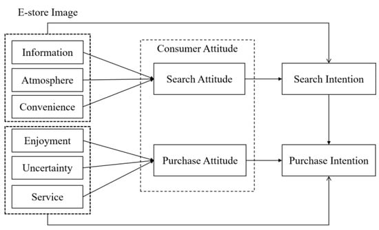 Consumers’ e-store search attitude refers to consumers’ positive or negative evaluation of online search behavior. For example, the e-store search is very attractive, and consumers like to browse the e-store irregularly, which is the attitude brought about by the positive e-store search image. Liu and Arnett [] found that a well-designed e-store can effect more customer revisits and improve attitudes towards e-stores and their products. The content and authenticity of the picture display (whether there are models or not) are important predictors of customers’ attitudes towards e-stores, and their attitudes are also strong predictors of behavioral intentions. E-stores can quickly and accurately get the information they want to search. They are very convenient, have aesthetic enjoyment, and can master the search experience for fashion trends, which improves consumers’ search attitude towards e-stores, thus affecting the search intention. Based on the above inference, this study proposes the following assumptions: