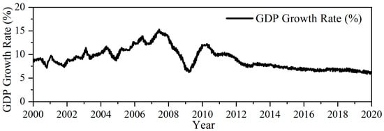It has been more than ten years since the outbreak of the Global Financial Crisis (GFC) in 2008. The GFC led to financial market volatility, and few would have anticipated some of the aftermath. In a world of financial instability, monetary policy will inevitably become key [,,]. Since the outbreak of COVID-19 in 2019, although COVID-19 has not caused a direct impact on China, China’s economic recession was caused by the COVID-19 lockdown, and the two major challenges facing China are the slowdown in economic growth and increased systemic risks. As China’s monetary policy easing cycle has unfolded round by round after the outbreak of COVID-19, the extent of credit easing has declined, and the stabilizing effect of monetary policy output has weakened for a time [,]. Figure 1 shows the change in China’s real GDP growth rate from 2000 to 2020. After the “Four Trillion” stimulus policy was implemented in 2009, real GDP in the first quarter of 2010 reached a high of 12.2%. Since then, China’s GDP growth rate has almost declined. After the second half of 2011, China’s economy bid farewell to the high growth model of double-digit growth in the past and entered a stage of medium-to-high-speed growth. In 2015, China’s real GDP growth rate fell below 7%, and by the third quarter of 2019, its real GDP growth rate dropped to 6.0%. [] The slowdown in economic growth may expose risks originally concealed by high-speed growth, such as multiple economic risks such as excess investment capacity, local debt, and real estate bubbles, and may promote the accumulation of systemic risks []. Various phenomena show that the endogenous growth momentum of the economy is insufficient and that steady growth and risk control are under pressure. Maintaining stable macroeconomic growth and preventing and controlling systemic risks have become some of the main goals of macroeconomic regulation under the “New Normal” []. It is necessary to deal with the complex issues facing the economy through monetary policy and other stabilization policies under the COVID-19 shock.