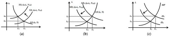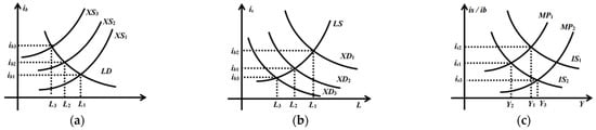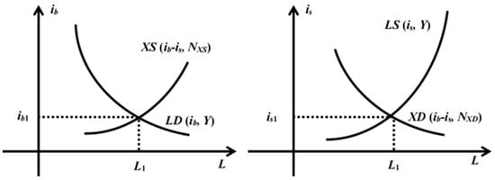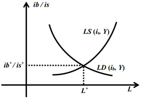 As shown in Figure 2, the intersection of the LS and LD curves determines the equilibrium interest rate and credit, and L*, respectively. The credit demand of the demander of funds can be expressed as LD = LD (ib, Y), where ib represents the interest rate at which the financial intermediary provides credit to the demander of funds, and LD changes inversely []. The rationale is that an increase in ib means an increase in financing costs, which reduces the demand for credit by those who need it, and vice versa. Y represents total income (output), the change of which shifts the LD curve. For example, a rise in Y makes the demand for credit of fund demanders increase at a given interest rate level, and the LD curve shifts to the lower left. The credit supply of the fund provider can be expressed as LS = LS (is, Y), where is is the interest rate at which financial intermediaries provide credit to demanders of funds, and LS changes positively. The reason is that the rise in is means that the fund provider can provide more income for the same amount of credit, increasing its credit supply. Y represents total income (output), the change of which shifts the LS curve [,]. For example, an increase in Y makes the supply of credit to the demander of funds increase at a given interest rate level, and the LS curve shifts downward to the right.