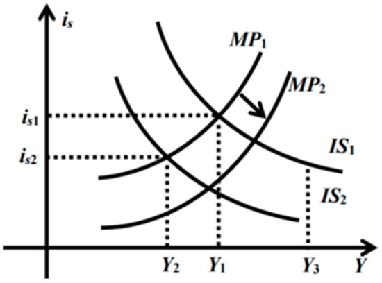 The IS–MP model is derived from a modification of the traditional IS–LM model and mostly differs from the traditional IS–LM model in that the MP curve is a direct assumption of central bank behavior []. Interest rates behave in a certain way as a function of macroeconomic variables (e.g., inflation and output). An example is the Taylor rule, rather than the assumption of following the money supply rule as assumed for the LM curve. The assumptions of the MP curve are more consistent with the way central banks behave than those of the LM curve. Therefore, this paper defines the monetary policy reaction function shown by the MP curve in accordance with the monetary policy rule setting: