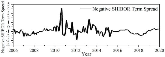 A negative SHIBOR term spread is shown in Figure 8. After the outbreak of the GFC, due to the increase in macroeconomic policy control, the negative SHIBOR term spread remains at a low level. With the tightening of monetary policy in 2010, the currency in circulation was relatively insufficient, and the negative SHIBOR term spread continued to rise. In June 2013, there were obvious fluctuations in money market interest rates, short-term liquidity tensions, and negative SHIBOR term spreads soared to local peaks. After 2015, the capital adequacy ratio of commercial banks rose steadily, and the negative SHIBOR term spread was at a moderate level.