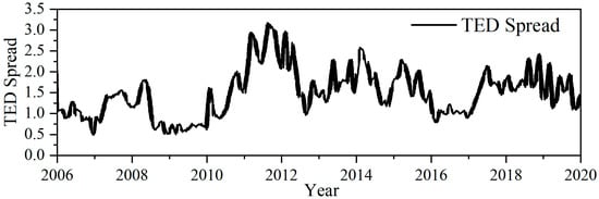 The TED spread reflects the magnitude of counterparty risk and liquidity risk among banks, as well as the tightness of market credit conditions. When the market risk rises, the risk premium required by the bank to the industry increases, the bank borrowing cost increases, and the borrowing cost of the real economy increases accordingly. When the financial pressure increases, the TED spread will widen. In this paper, the 3-month interbank offered rate is used to represent the interbank offered rate, and the 3-month Treasury bond maturity yield is used to represent the risk-free interest rate. Figure 9 describes the changes in the TED spread within the sample range. Similar to the trend of negative SHIBOR term spreads, the TED spreads have also experienced a post-policy easing phase, a higher phase starting in the second half of 2010, and a weakening phase starting in 2015.