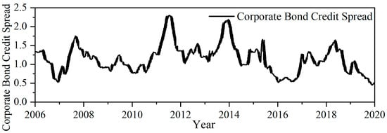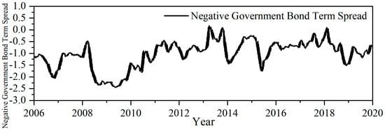This paper uses a negative Government Bond Term Spread (negative-GBTS) and Corporate Bond Credit Spread (CBCS) to reflect the risk in the bond market. The larger the negative-GBTS, the greater the popularity of long-term government bonds compared with short-term government bonds, and the higher the risk aversion. On the contrary, the smaller the negative-GBTS, the higher the risk appetite of the market and the less financial stress. This paper uses the difference between the 3-month Treasury bond yield to maturity and the 10-year Treasury bond yield to maturity to calculate the negative term spread, as shown in Figure 10. The raw data are daily, and their monthly averages are taken.