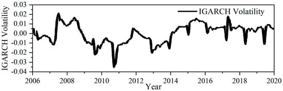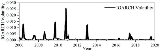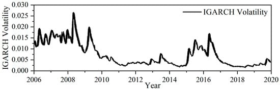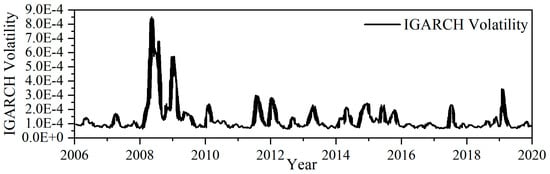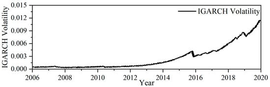 This paper chooses stock market volatility to reflect the uncertainty of the securities market and to measure financial risks. The volatility of the stock market is represented by the IGARCH volatility of the Shanghai Composite Index, and an IGARCH (1, 1) model [] is established for the logarithm of the Shanghai Composite Index: