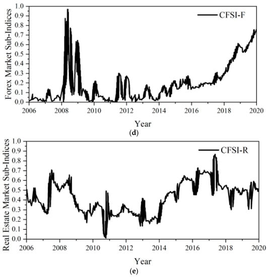 From the perspective of operation, this paper selects FSI indicators from two dimensions. The first dimension starts from the composition, and the selected indicators cover the entire financial system as much as possible, so that the Financial Stress Index can better describe the stress level of the entire financial system [,]. As shown in Figure 7, the financial system is divided into three main parts: financial intermediaries, financial markets, and financial infrastructure. This paper selects China’s main financial market indicators to construct the CFSI to measure the risk accumulation. At present, most scholars do not consider the real estate market within the characteristics of the design of the financial system []. Therefore, this paper chooses the currency market, bond market, stock market, forex market, and real estate market to describe the pressure of the financial market, respectively.