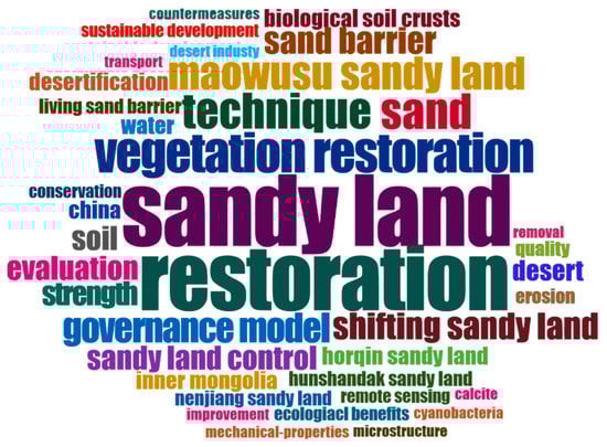 Cloud map of keywords in the sand-restoration technology research literature. The font with a large size represented the keywords that appeared at a high frequency.