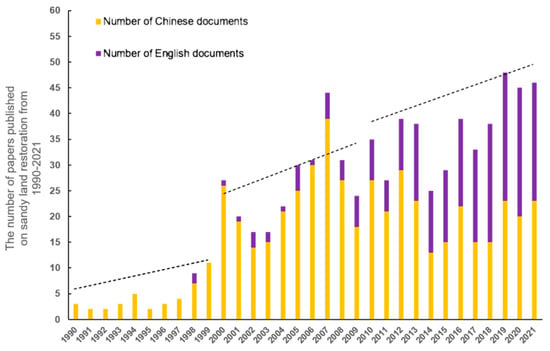 Number of papers published on sandy land restoration from 1990 to 2021. The dotted line represents the growth trend of the number of published papers from 1990 to 1999, 2000 to 2009, 2010 to 2021.