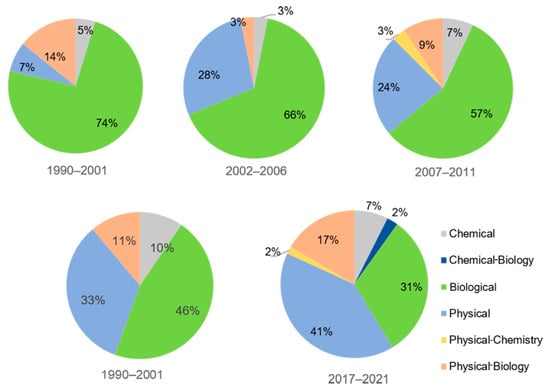 As shown in Figure 4, from 1990 to 2001, sandy land restoration primarily focused on biological aspects, especially vegetation restoration technology, followed by physical technology or physical–biological technologies. Other aspects were relatively less studied. From 2002 to 2011, research entered the stage of rapid development, vegetation restoration technology was still the mainstream direction of research, and physical technology gradually received attention and development. In the period 2012–2021, the application of physical–biological techniques such as sand-shifting-control-forest, sand barriers, and fenced enclosure still occupied a high proportion. The application of surface crust and soil improvement increased, during which process new technologies such as a sand barriers made of polymer materials and microbial chemical crust were born, and a combined physical–biological treatment model was developed, while other aspects have not significantly changed.