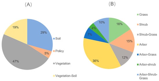 In the classification of the restoration targets directed by the use of the technology, the vegetation element was the natural element that received the most attention (47%), followed by the soil element (29%) and the vegetation–soil complex elements (19%) (Figure 5A). It is worth noting that some cases of restoration methods are aimed at desertification control policies and, although there is no physical object, they provide great guidance for restoration work.