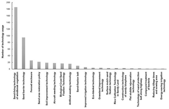 As you can see from Figure 6, the combination of similar techniques yields 20 major repair types (Figure 6). Of these, windbreak vegetation fixation was the most studied and used sand ecological restoration technique in all cases (186 times), followed by sand-barrier fixation (95 times) and fenced enclosure (26 times). Other common (>10 times) sand-restoration and sand-management techniques include soil amendment, aircraft seeding, surface crusting for sand fixation, and artificial seeding. For the less frequent methods (occurring less than 5 times), such as energy-efficient power generation irrigation, rice cultivation in the sand, and fungal complex treatment, the conditions of the selected study area are more specific. Hence, the scope of use is narrower and the number of reported cases is low, but they do provide new ideas for sand-restoration research to explore.