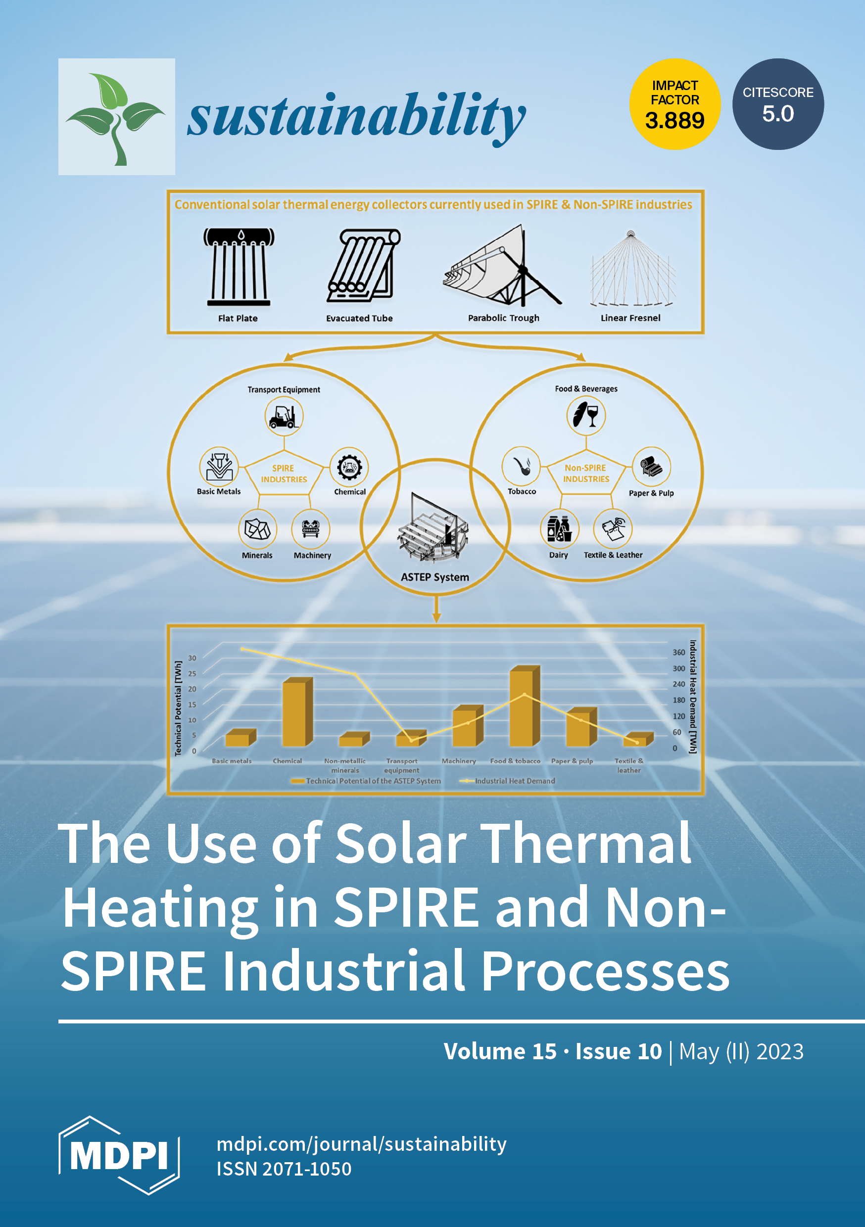 Cover Story: This paper investigated the use of solar thermal energy systems in SPIRE and non-SPIRE industries and reported that existing solar systems are primarily applied to lower-irradiance regions due to the limited operating temperature range of the current collectors, which particularly affects the SPIRE sector. In order to increase the use of solar energy in these sectors, an innovative solar thermal system was developed by the EU-ASTEP project, with the capability of achieving a temperature of up to 400 °C. The calculated technical potential of the ASTEP system in EU industrial processes was shown to be 43.5 TWh for the SPIRE sector and 37.7 TWh for the non-SPIRE sector, which reduced greenhouse gas emissions by 10.8 and 9.4 MtCO2e. Consequently, the novel solar thermal system has the potential to help industries in reaching their net-zero GHG emission targets by 2050. View this paper - Issues are regarded as officially published after their release is announced to the table of contents alert mailing list .